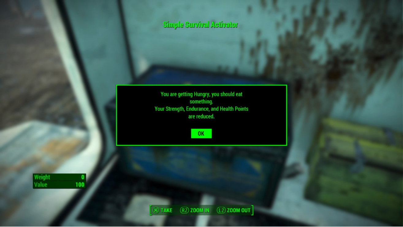 To activate this mod, loot the “Simple Survival Activator” From the “Simple Survival” chest outside of Vault 111 at the start of the game, the chest can be found across from the button that opens up the vault. Looting this activator adds a perk to your character called “Simple Survival” that adds Debuffs to your character when you have not recently Slept, Drank, or Eaten. After using the Bottle Activator you can refill empty bottles at water sources.