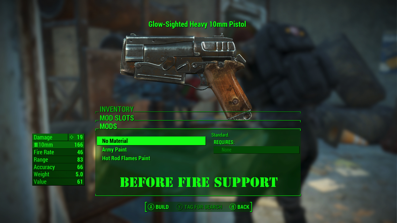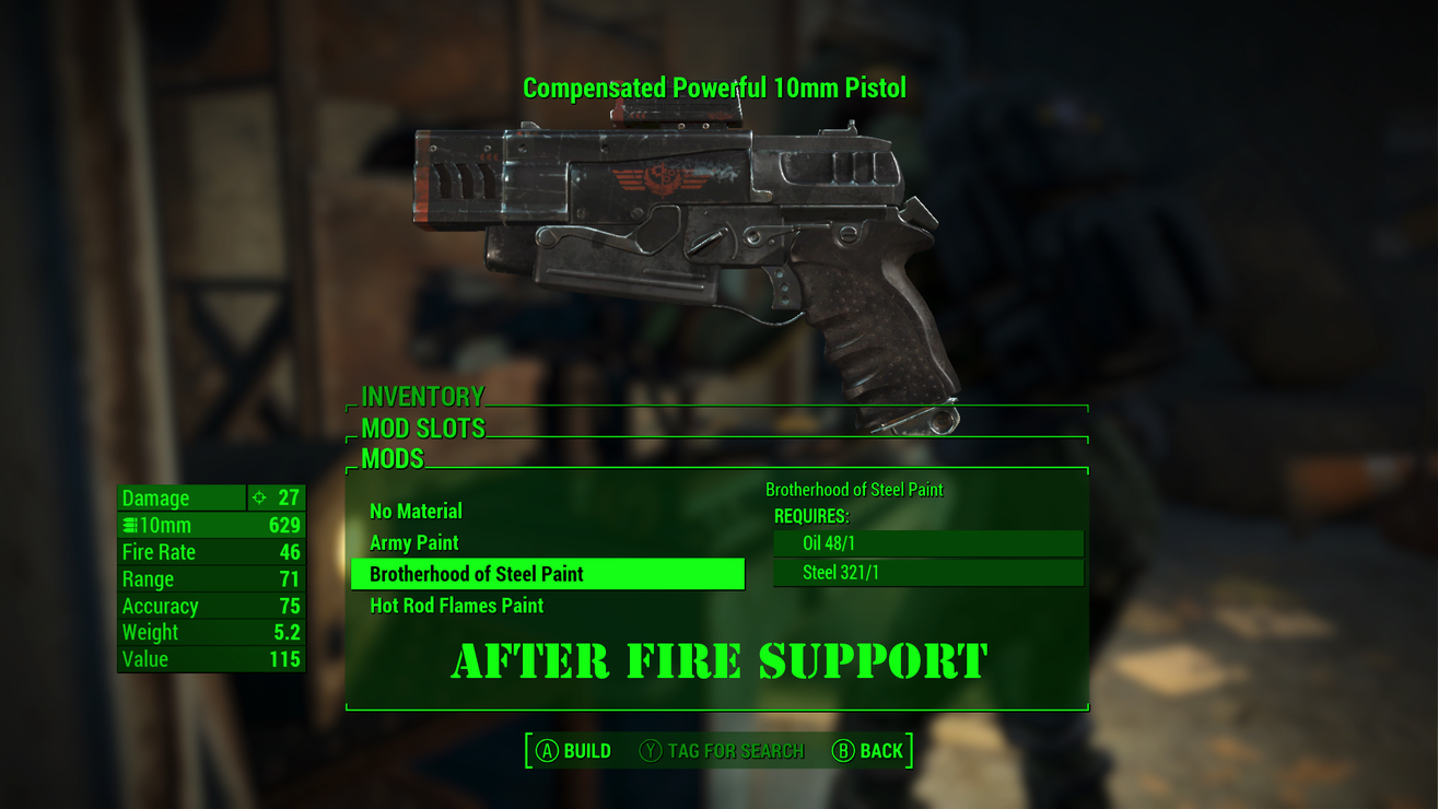Faction Weapon Skins Requirements - BoS, simply adds a get stage done condition to the BoS Weapons Paint Job recipe that requires the player to have joined the Brotherhood of Steel by talking to Paladin Danse at the end of “Fire Support” to unlock the new paint jobs.
