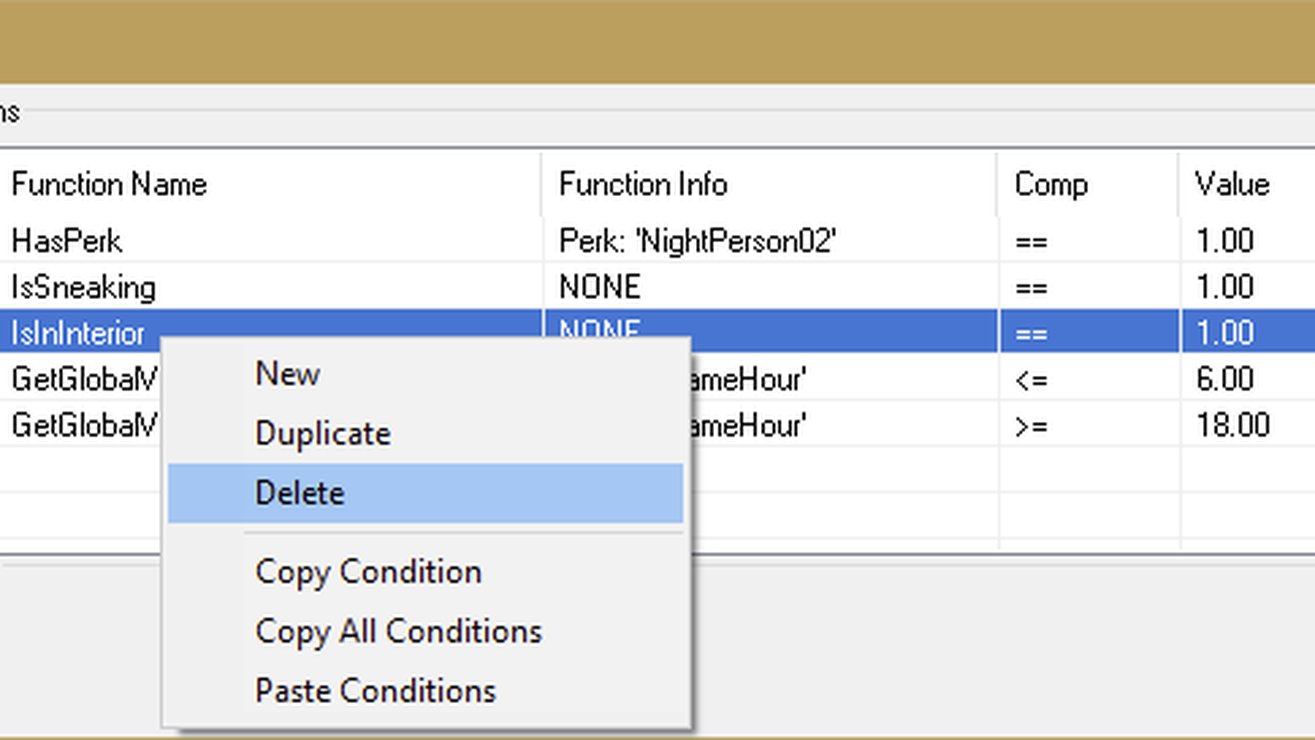 Want to see how to make a mod in action? This mod was made by doing what the cover image shows: deletes the annoying always-on night vision in interiors (IsInInterior == 1) while sneaking.