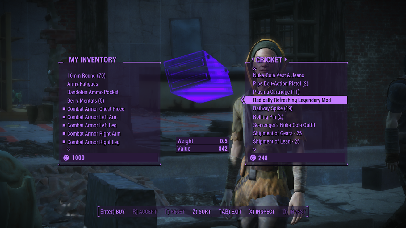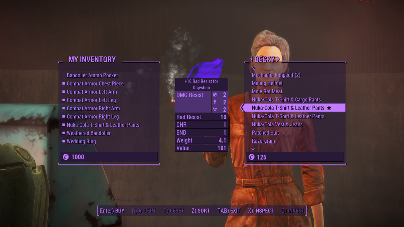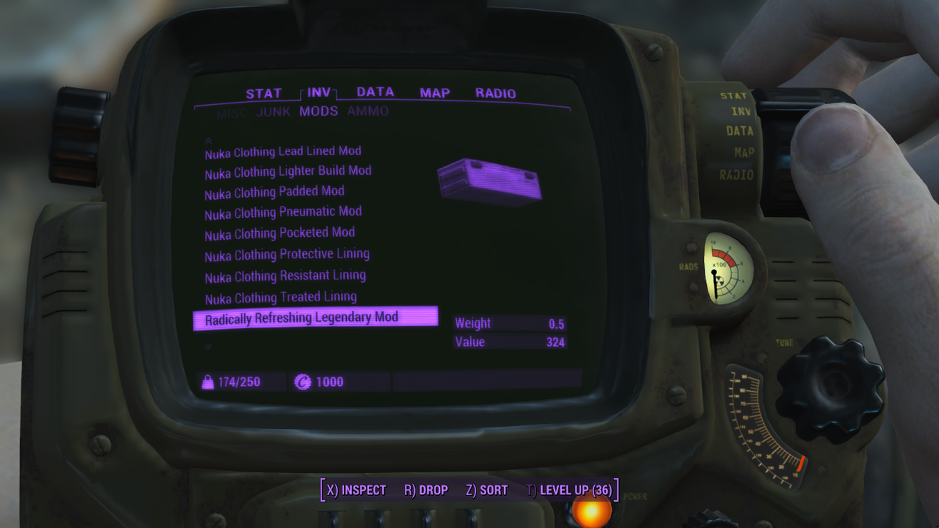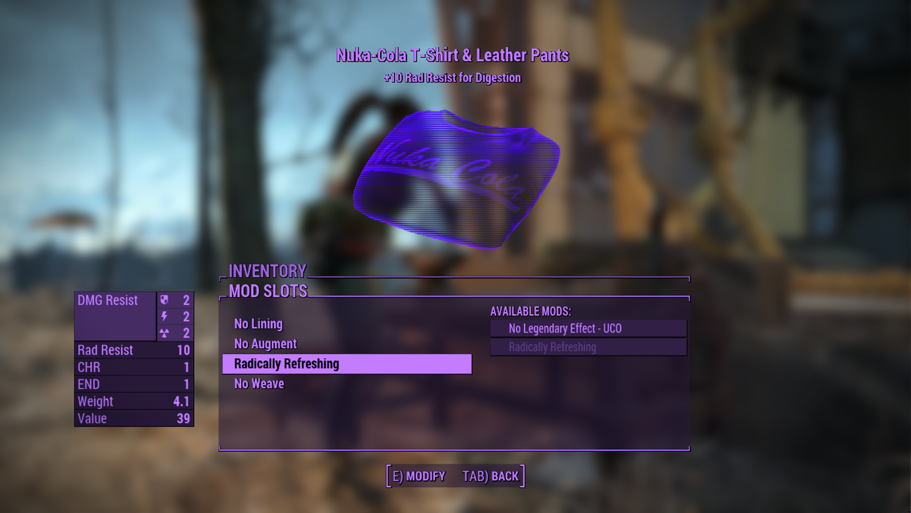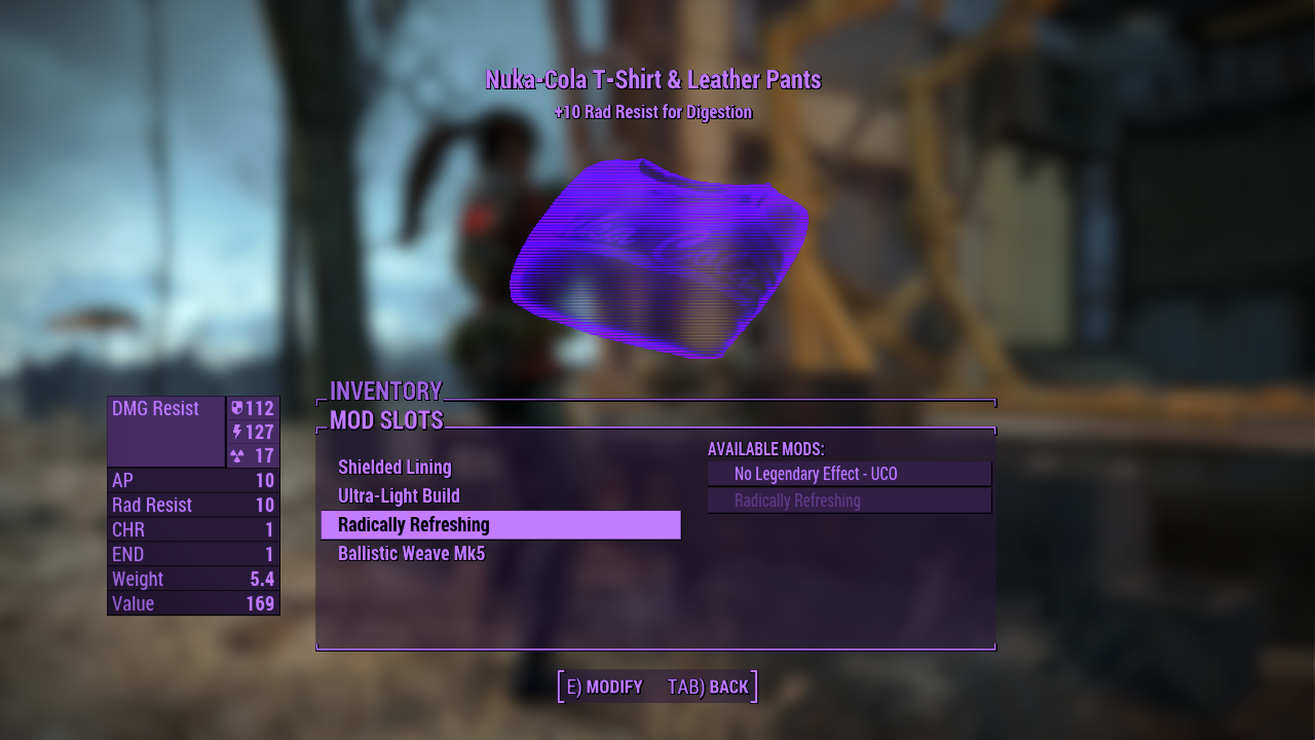 Hey there Nuka-Cola lover! Have I got something for you! All that irradiated goodness you’ve been ingesting since departing the vault has given your stomach a little extra protection! When you’re wearing an outfit from the Nuka-Cola Collector Creation Club content while it has the new “Radically Refreshing” Legendary Modification, a sugary sweet Nuka-Cola only gives +1 rad! In fact, this affects all ingested food so you can enjoy the sumptuous treats the wasteland has to offer practically rad free! Finally get a slice of preserved pie? Worried about what’s inside? Who cares?! With this, everything is “Radically Refreshing”!