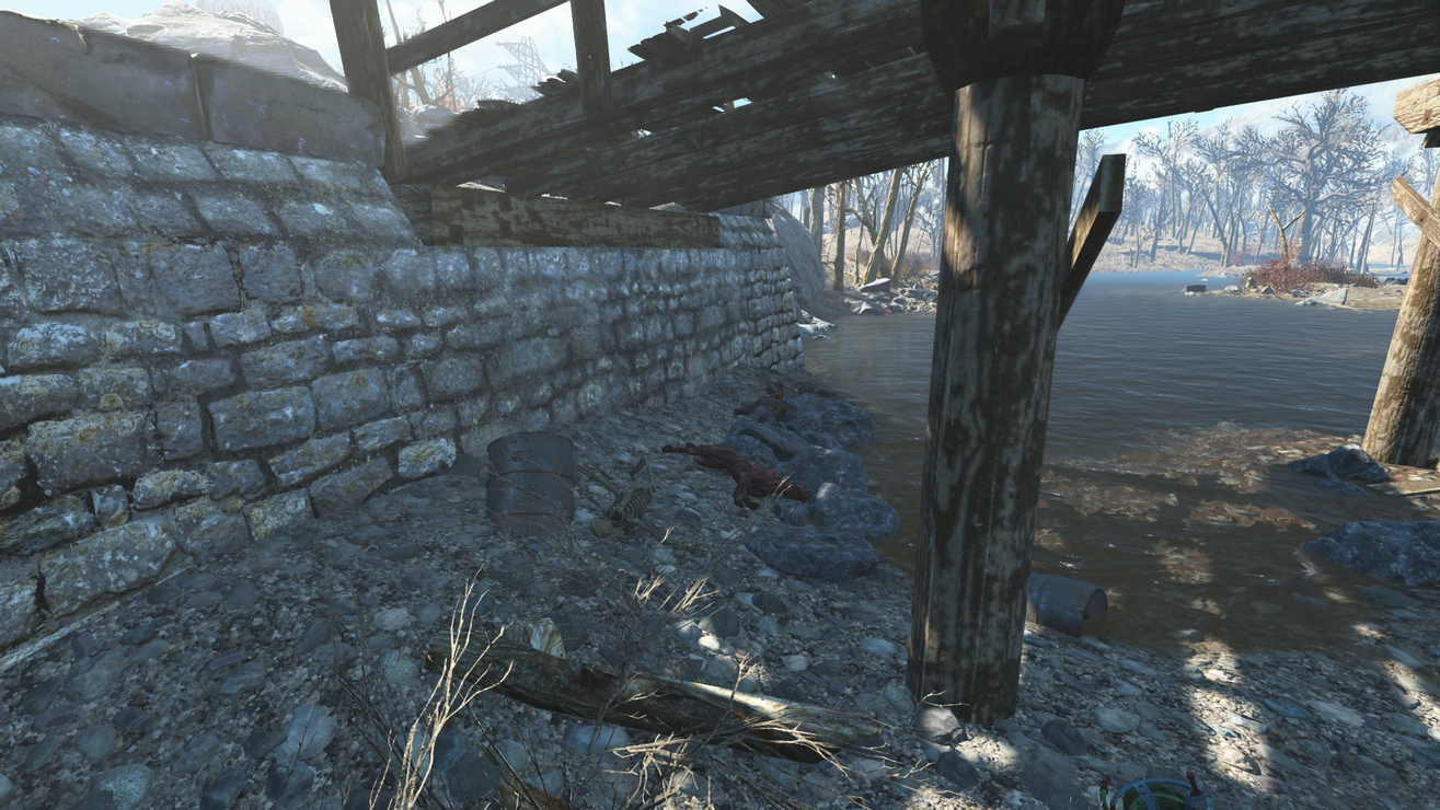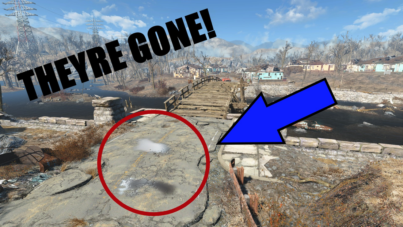 This mod simply relocates the dead mongrel and raider just outside of Sanctuary, it is now under the bridge. They will both still remain there forever, but they are out of sight. And I also removed the blood splatter too. Now you can come back home to Sanctuary without having to trample over a naked corpse!
