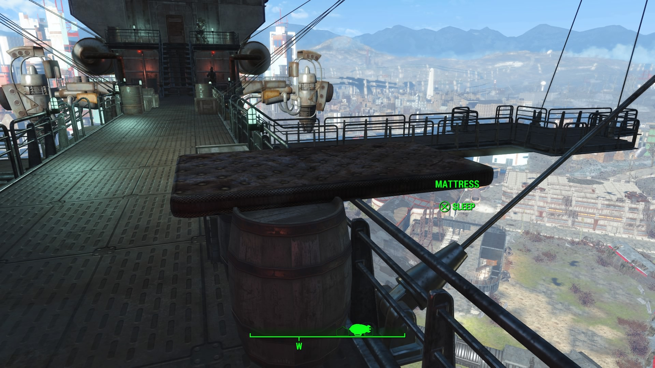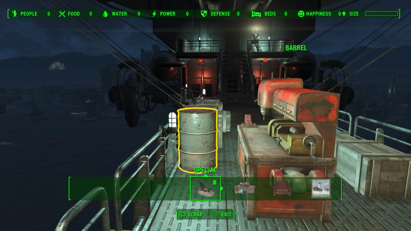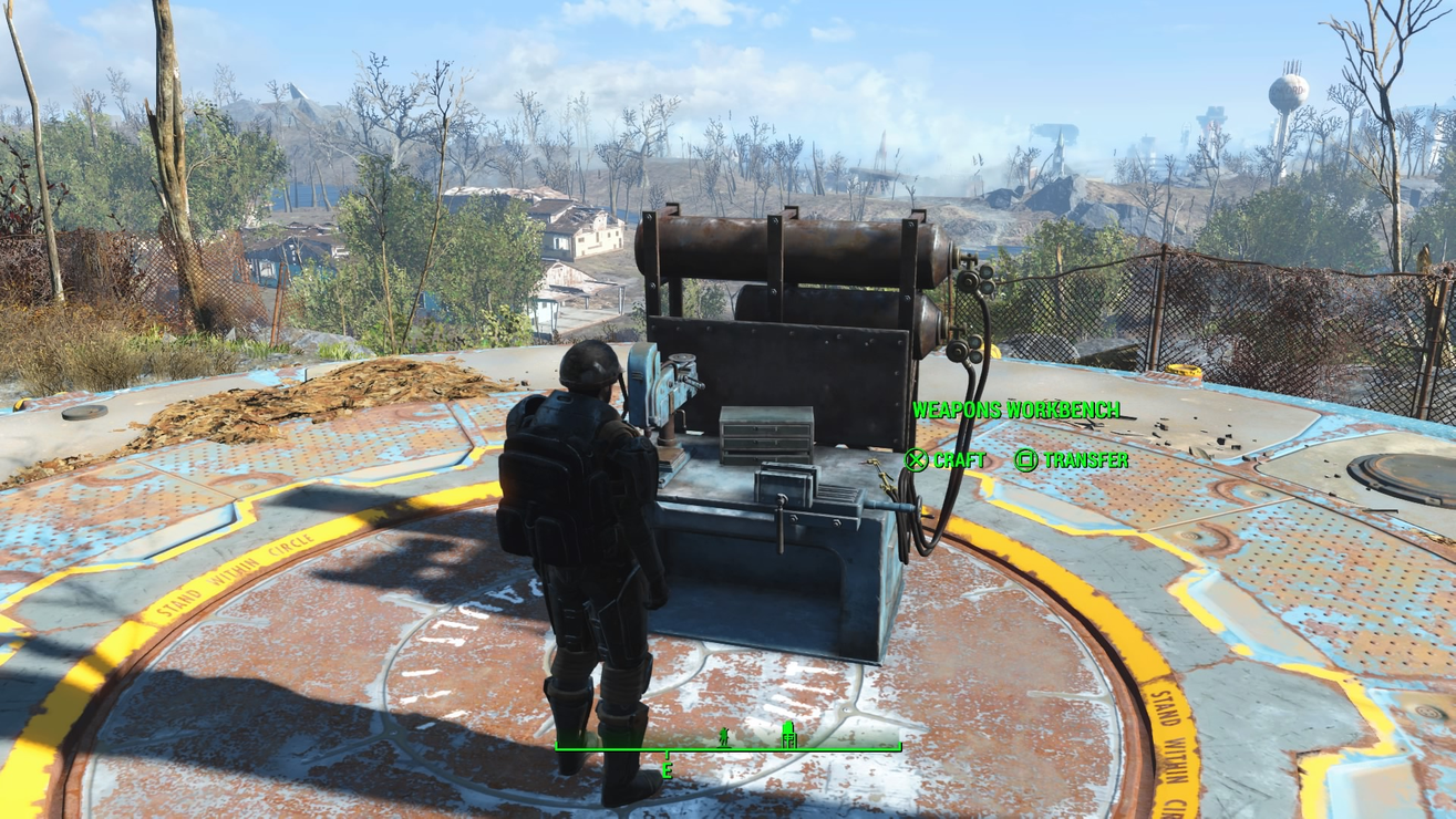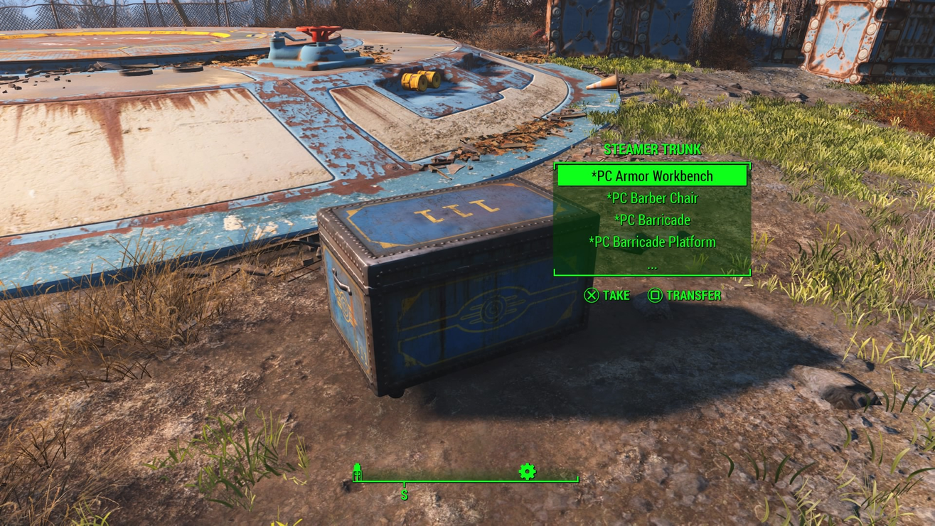 In a trunk right outside of Vault 111, you will find an Object Eraser (knife) and a collection of rings blessed by the Nine Divines…I mean, imbued with amazing technology. Equip one of these rings, and the object of your desire will appear right where you’re standing, oriented in the direction and angle you’re facing. If you like, you can equip and unequip a ring without ever leaving your inventory menu, and your object will still be placed when you leave the menu. If you change your mind about that object, or you don’t like the way it’s facing, just use the Object Eraser to whisk it away to the void, and make another one. You can build and destroy each object as many times as you like. All workbenches, the surgery and barber chair, and even the workshop are functional wherever you place them.