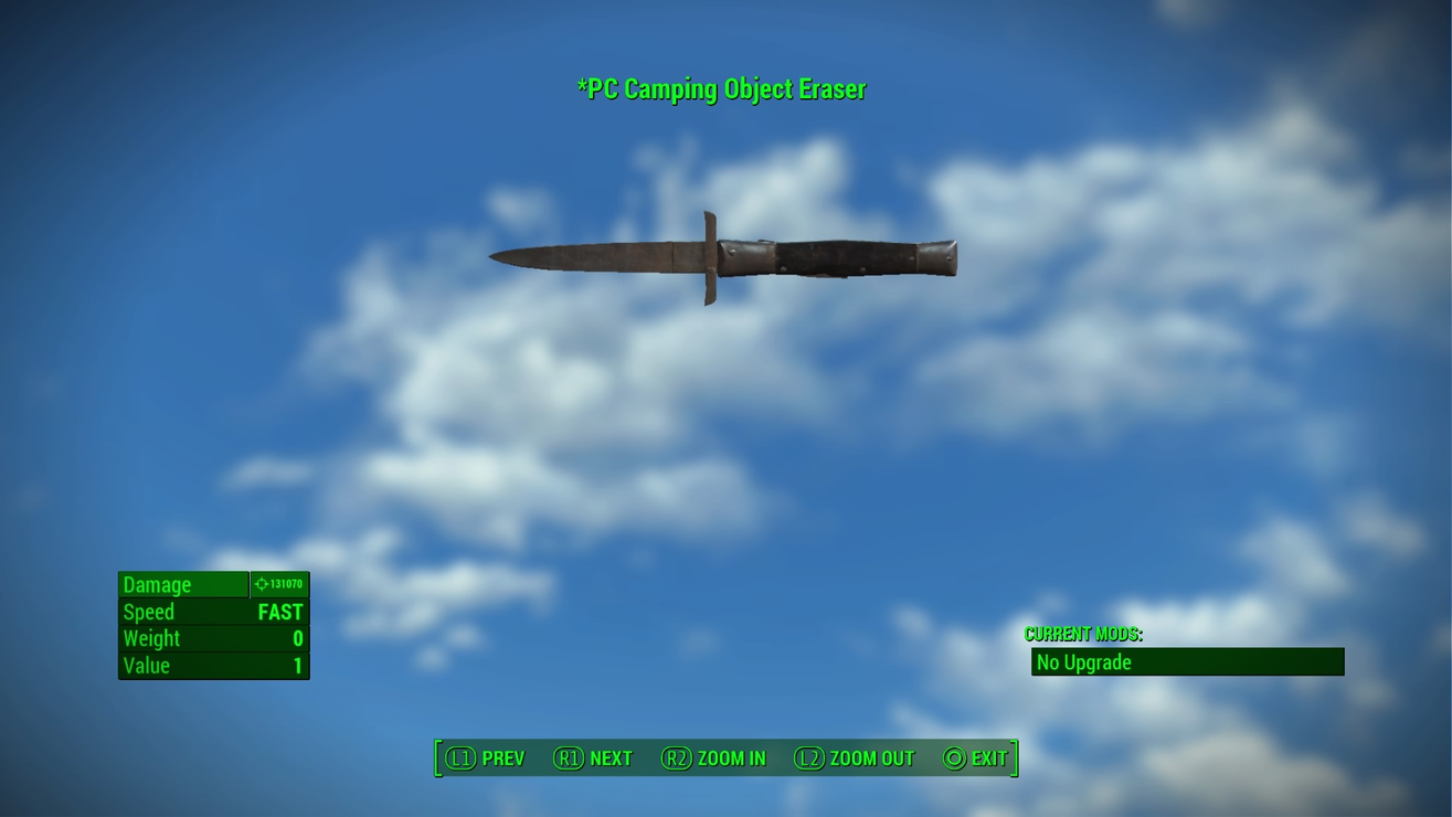 You could use the Doorbuster from another one of my mods, Destructible Doors & Gates, to destroy these objects, and you could use the Eraser from this mod to destroy doors and gates if you have Destructible Doors & Gates installed, so you don’t have to carry two weapons around for both these mods. Both weapons just do 65,535 base damage, which usually equals over 100,000 damage per attack, and all Portable Camping & Construction objects have 100,000 health, just as doors and gates do with Destructible Doors & Gates. For that matter, you could use either weapon as an instant kill cheat weapon if desired.