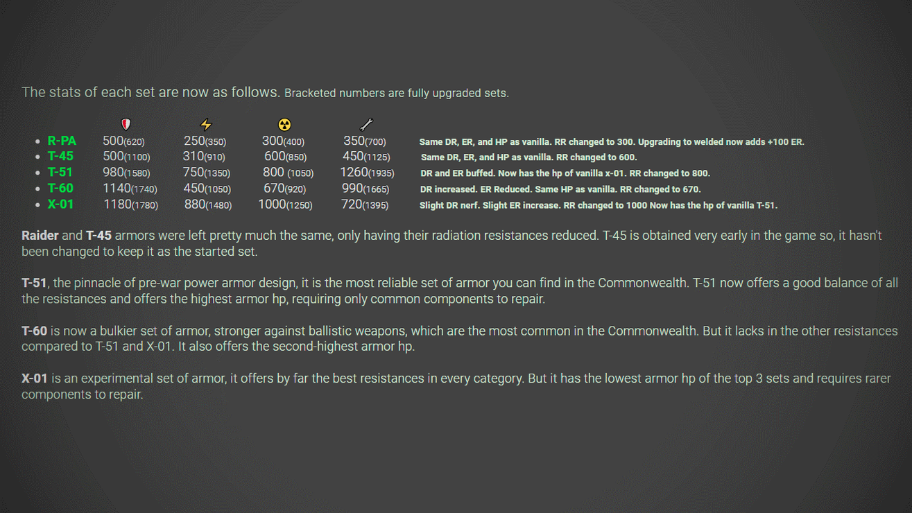 The way Fallout 4’s power armors work when it comes to resistance values is very, very linear. It goes from Raider > T45 > T51 > T60 > X-01, with each set being stronger in every way except radiation resistance. You could argue this makes sense gameplay-wise, but in my opinion, it’s a very boring way of handling the balance between each set. Fallout 76 tackled this in a more interesting way by giving each set more unique resistance values to set them apart. This mod aims to do the same thing with Fallout 4’s power armors. The high tier armors, T-51, T-60, and X-01 now have pros and cons, and each set now has a unique radiation resistance now, instead of every set giving you 1050.