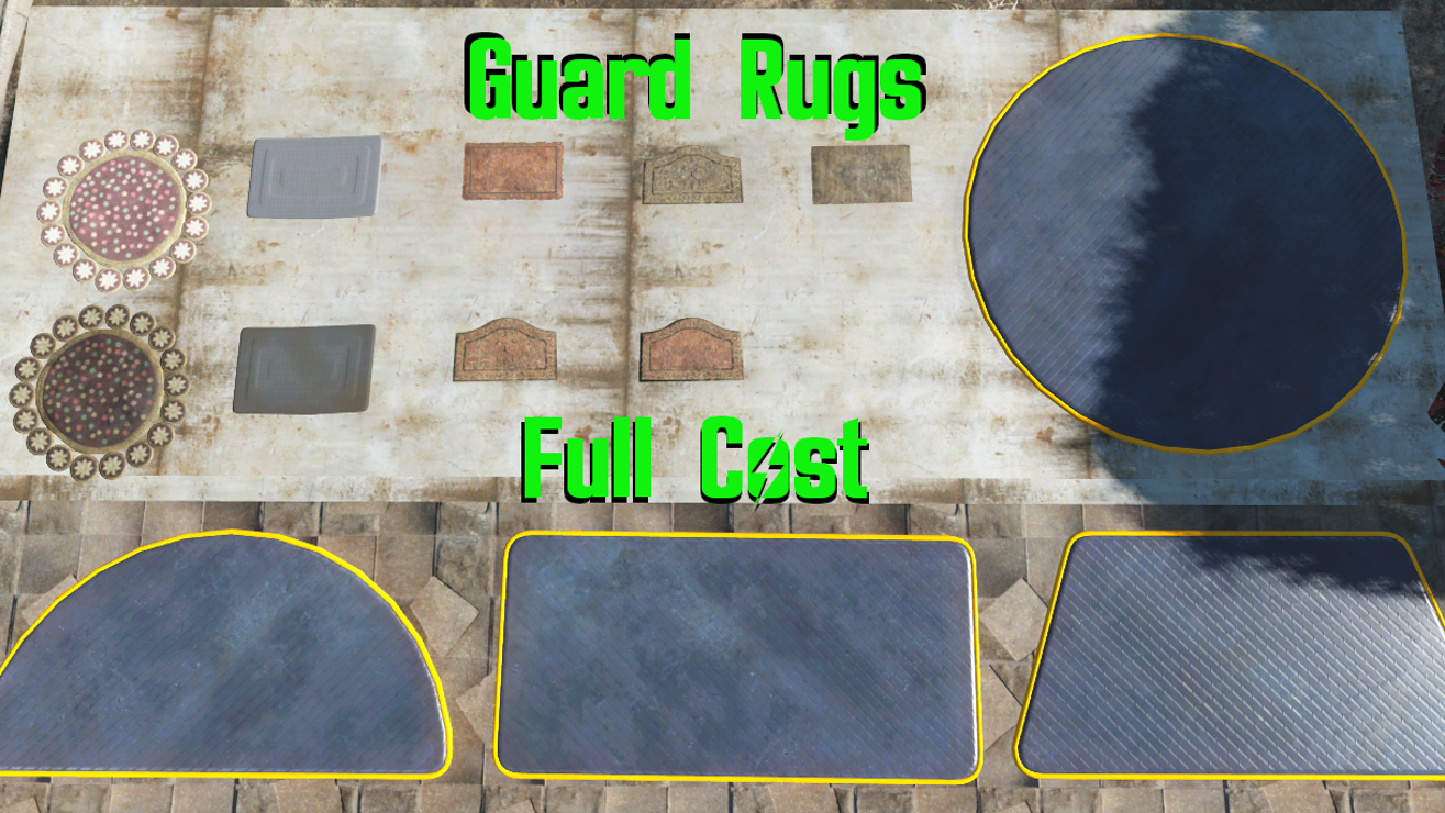 Guard rugs at the full cost of the vanilla guard post. Multiple varieties: postwar, prewar, institute.