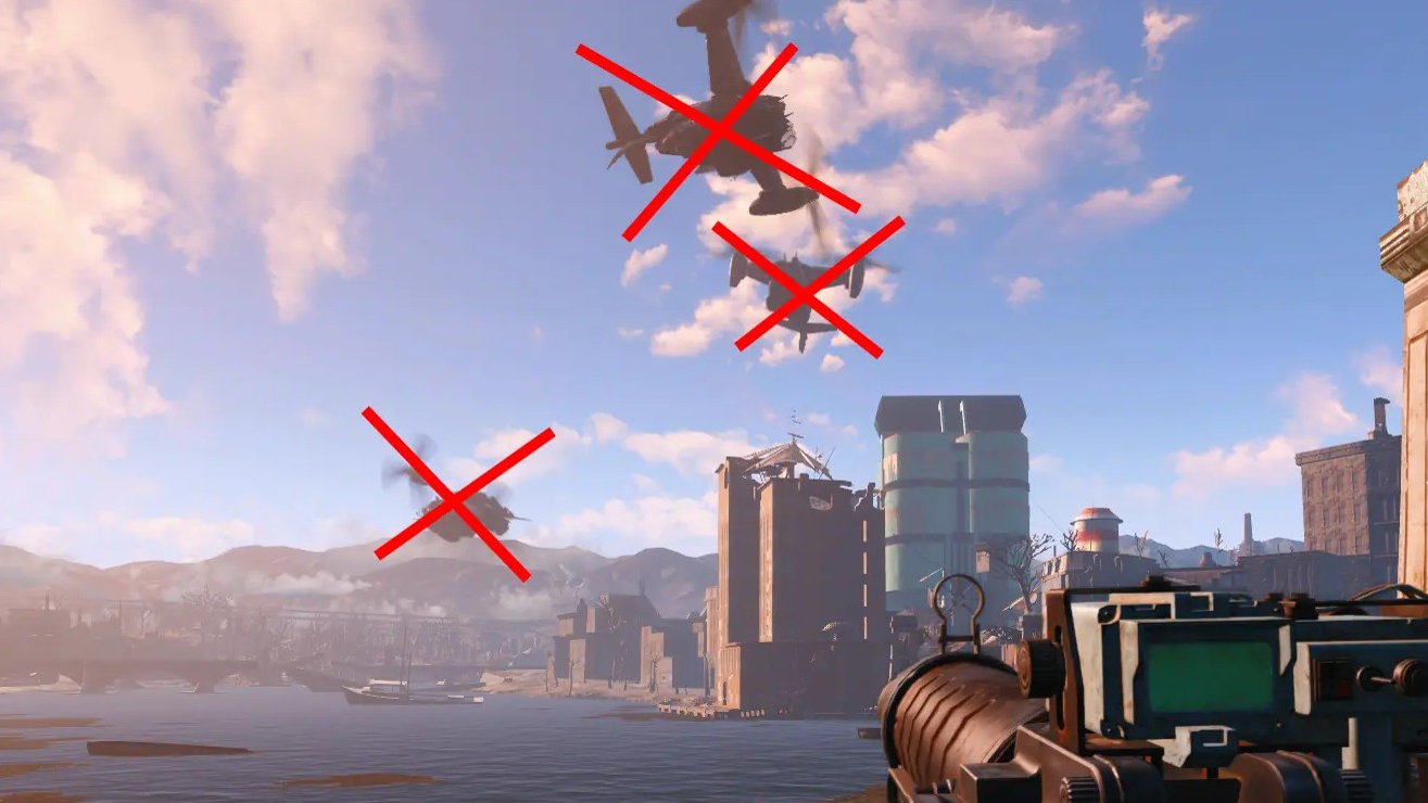 They took 10 of those 12 encounters and copied them in to their own separate lists and placed new triggers around map for them. There does not seem to be any kind of cooldown on these so if you don’t fast travel but walk around Boston you constantly activate these triggers and spawn Vertibirds. And quite often you will trigger 2 or even 3 Vertibirds at the same time: You trigger one from normal random encounter pool and second one from this extra Vertibird-only pool. Then you chase down one Vertibird and since their AI is dumb as Skyrim’s Dragon AI, he flies near another trigger and POP, now you have 3 Vertibirds spawned!