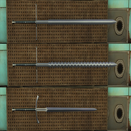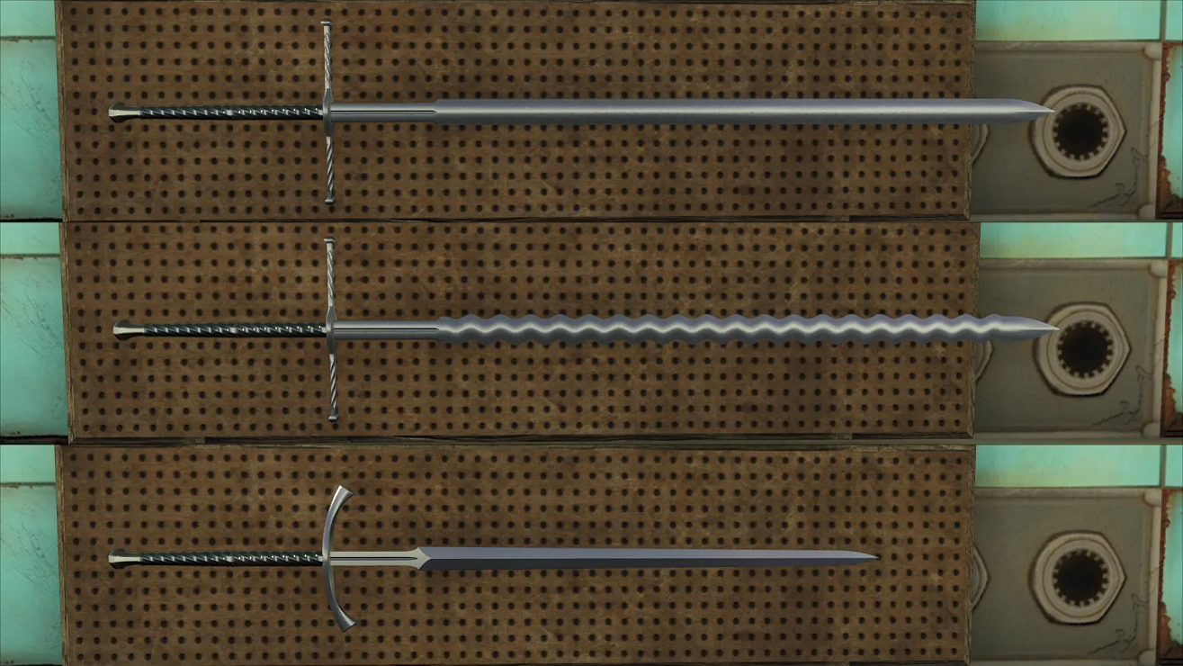 You get a choice of three different blades (long lenticular, flambard or diamond section) and two crosses (curved and spiral straight). The larger lenticular blades cause slightly more stagger and a moderate ammount of bleeding, while the stiff diamond section blade is armour-piercing, but otherwise they’re mostly an aesthetic choice. The combination of curved cross and the included diamond blade is a combination almost exclusively used in Denmark, while that grip with the straight cross and lenticular blade is technically a lowland claymore. But it’s similar enough to other greatswords, especially German ones. (A lot of Scottish claymores actually used German blades.) Or you can build any combination that suits your style more. You will need at least 1 level of Blacksmith perk to forge a new blade or cross for your sword. It starts somewhat tame in damage potential, but each level of the Blacksmith perk allows you to upgrade your sword’s heat treatment, to increase damage significantly. Unlike the blades and crosses, these upgrades do NOT give you a boxed item when removed, since it’s not an actual component you’re producing. It’s basically the same idea as sharpening your sword in Skyrim. Fully upgraded, it does the same physical damage as a sledge hammer with the Nuka World upgrades, but without the fire or electrical damage or such. It swings faster, though, and has a higher crit multiplier, so it should actually do top-end dps. Basically I’m aiming for the same balance point that Bethesda thought is a good endgame weapon.