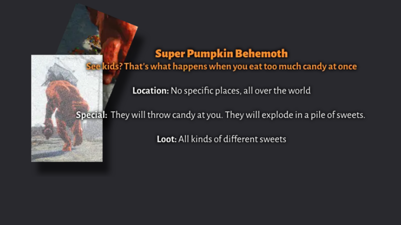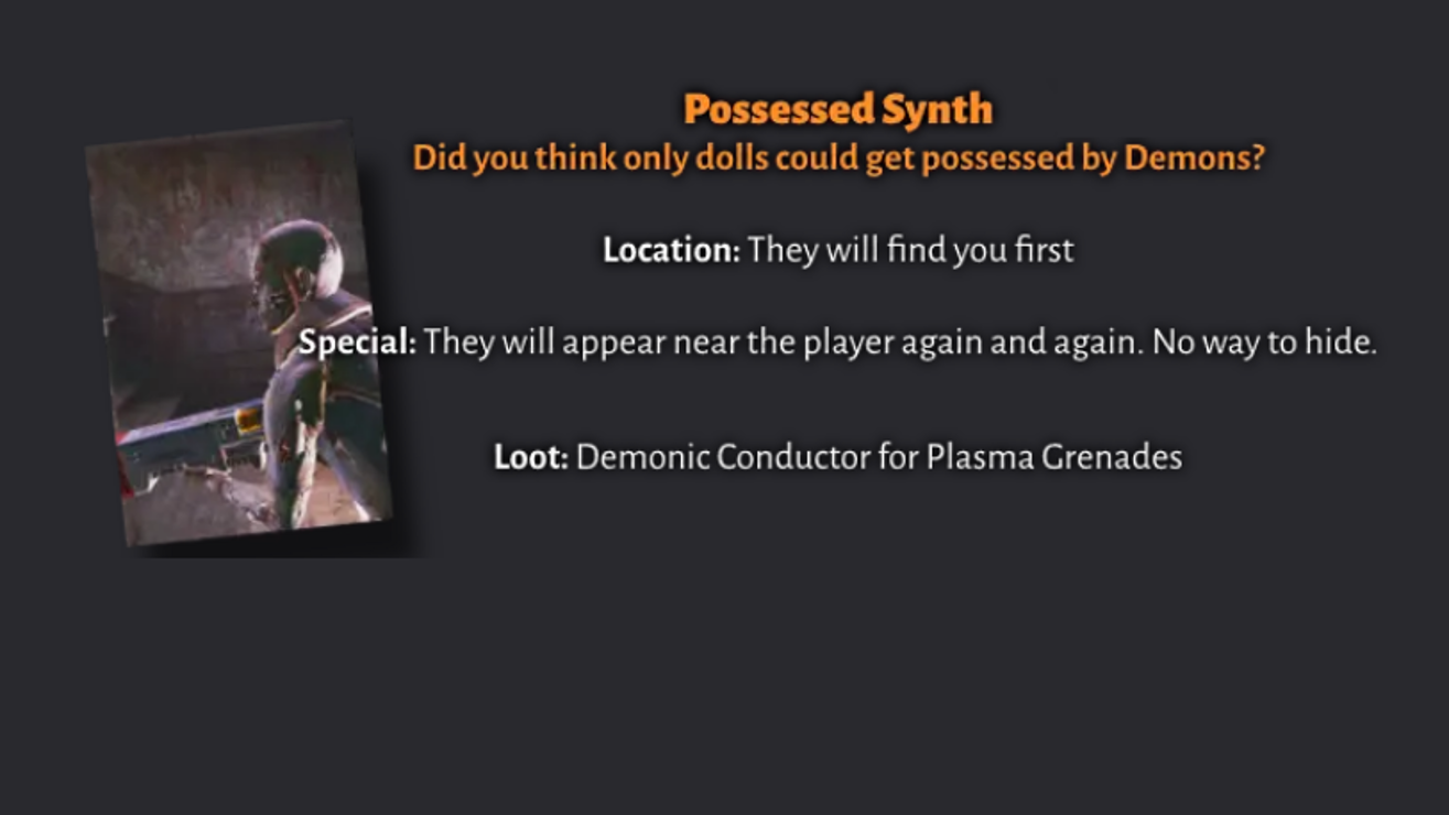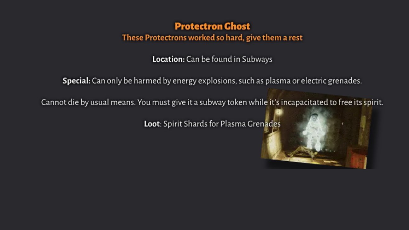 Special: Can only be harmed by energy explosions, such as plasma or electric grenades. Cannot die by usual means. You must give it a subway token while its incompacitated to free its spirit.